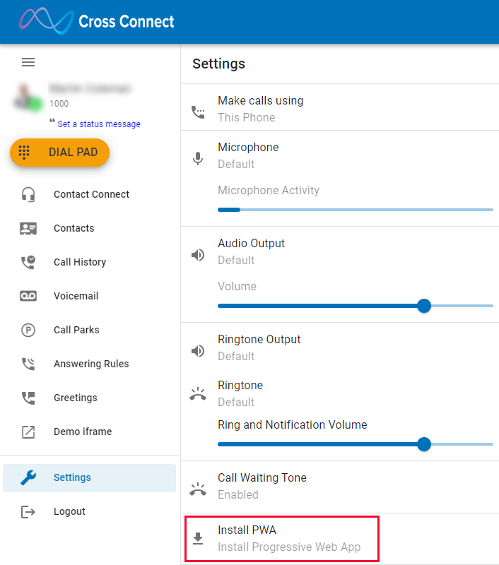 The progressive web app allows for a user to install the Call Connect web app as an application on their desktop which allows the app to recieve desktop notifications for calls and messages, be convieniently launched from the task bar as well as starting the app when the machine starts.
